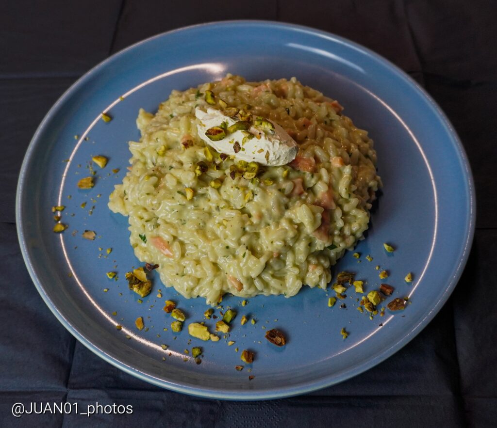 Prepared with Carnaroli rice, prized in Italy for its structure and creaminess, this risotto is cooked slowly, with care. This week, it comes with tender salmon, a gently aromatic pistachio pesto and a soft mascarpone quenelle that brings everything together.