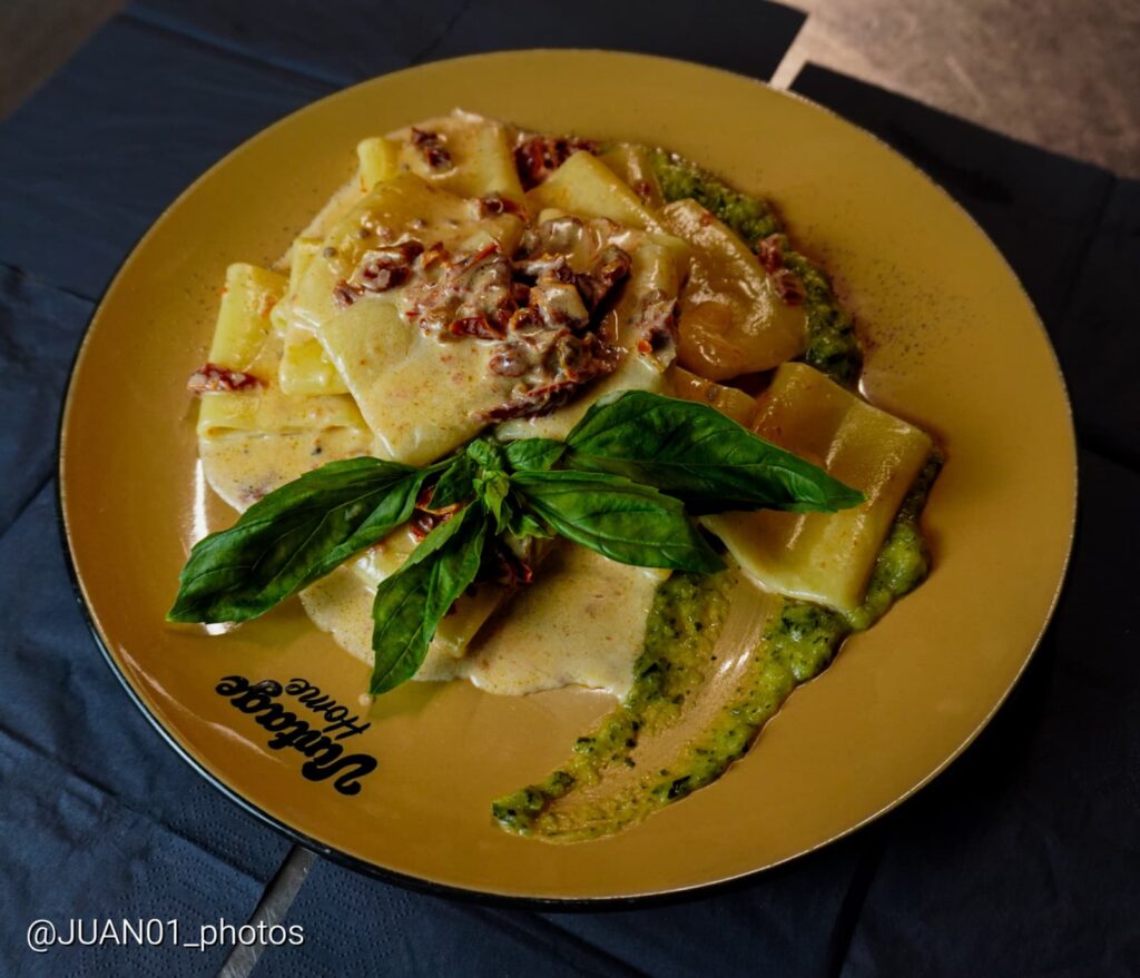 The Paccheri with zucchini cream, buffalo mozzarella and sun-dried tomatoes offer a bright, vegetable-forward plate, softened by creamy notes and gentle acidity.