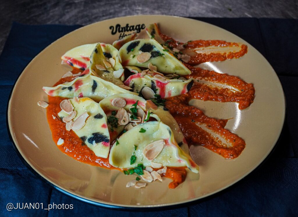 Eliche stuffed with prawns, tomato sauce and toasted almonds balance sea notes with warmth and texture.