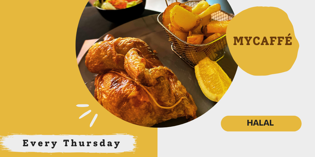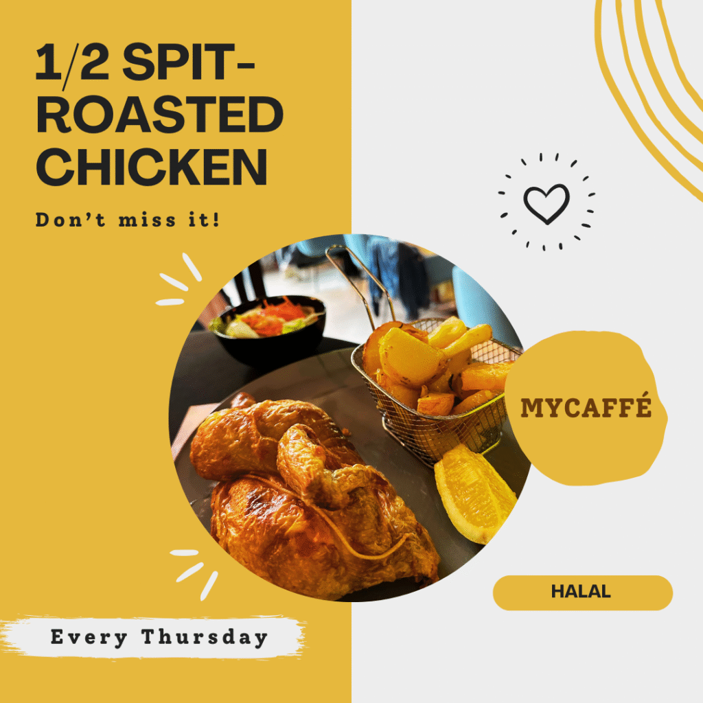 Every Thursday, MyCaffé serves its half halal spit-roasted chicken, accompanied by sautéed potatoes and a fresh salad. A generous plate. Straightforward. Comforting. The kind of dish you come back to.